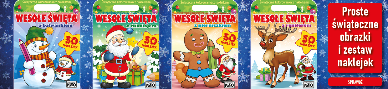 Seria kolorowanek „Wesołe święta” wprowadza dzieci w atmosferę świąt Bożego Narodzenia. Urozmaicone, pogodne rysunki i wesołe naklejki przywołują magię tych świąt oraz zimy.
